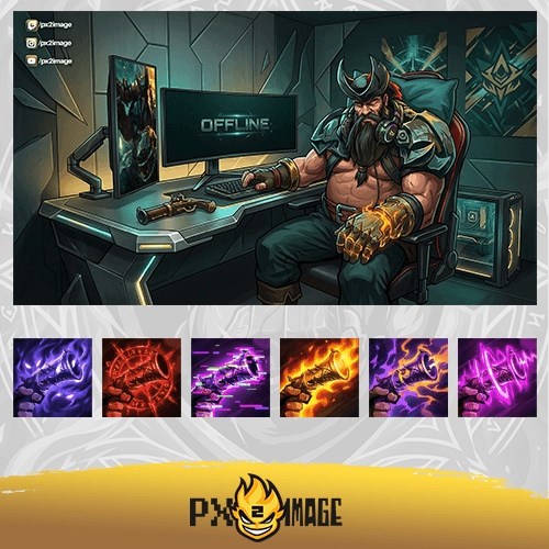 Gangplank şampiyonu; yüksek mekanik gereksinimi, zamanlama odaklı fıçı komboları ve global ultisiyle oyunun temposunu hem koridorda hem de haritanın her noktasında belirleyebilen eşsiz bir savaşçıdır. Bu yayıncı paketi, Gangplank’in barut, deniz ve korsan estetiğini yansıtan animasyonlu overlay tasarımları, paneller, sahne geçişleri ve yayın içi grafikler içerir.